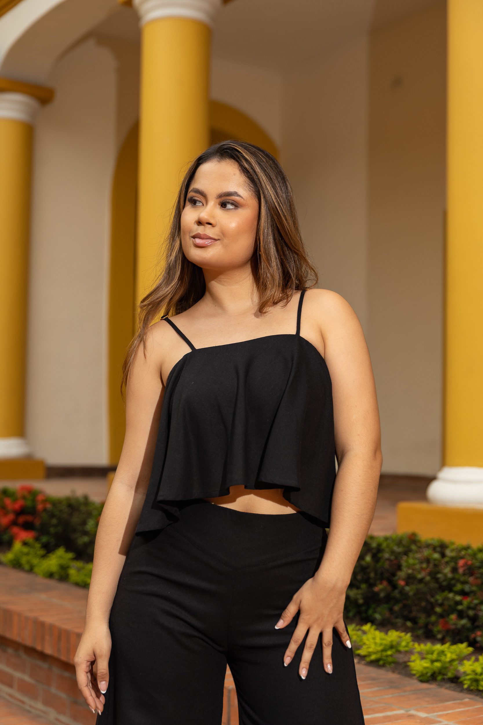 Set en lino unicolor de 130 grms, pantalón tiro alto, pretina ancha, con cremalleta al lado, bota ancha, blusa con tira, blusa volada sobre la pretina