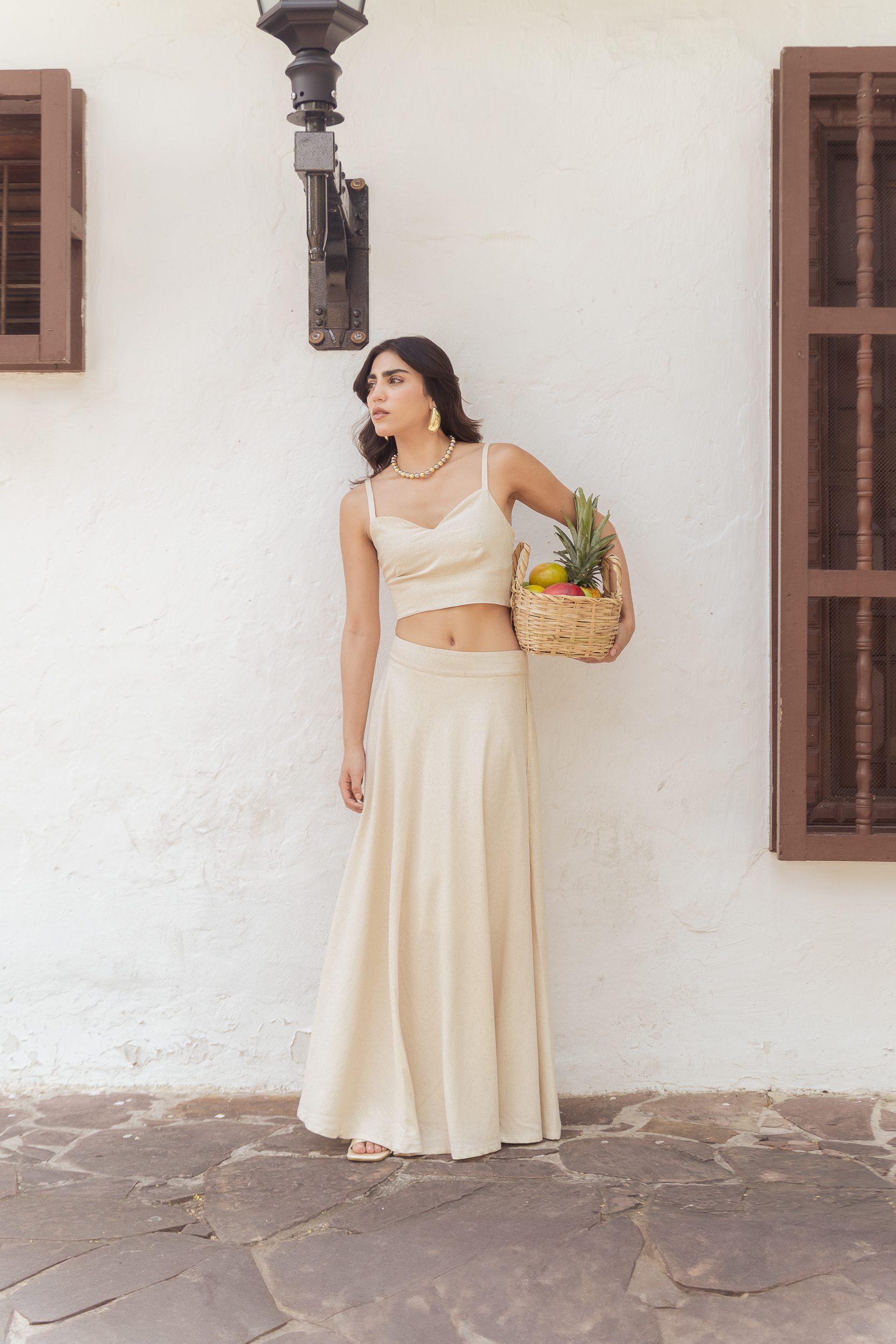 Set en falda en lino unicolor, falda con pretina ancha, caida rotonda, blusa corta, con tiras ajustables, escote en v, encauchado en la parte de átras
