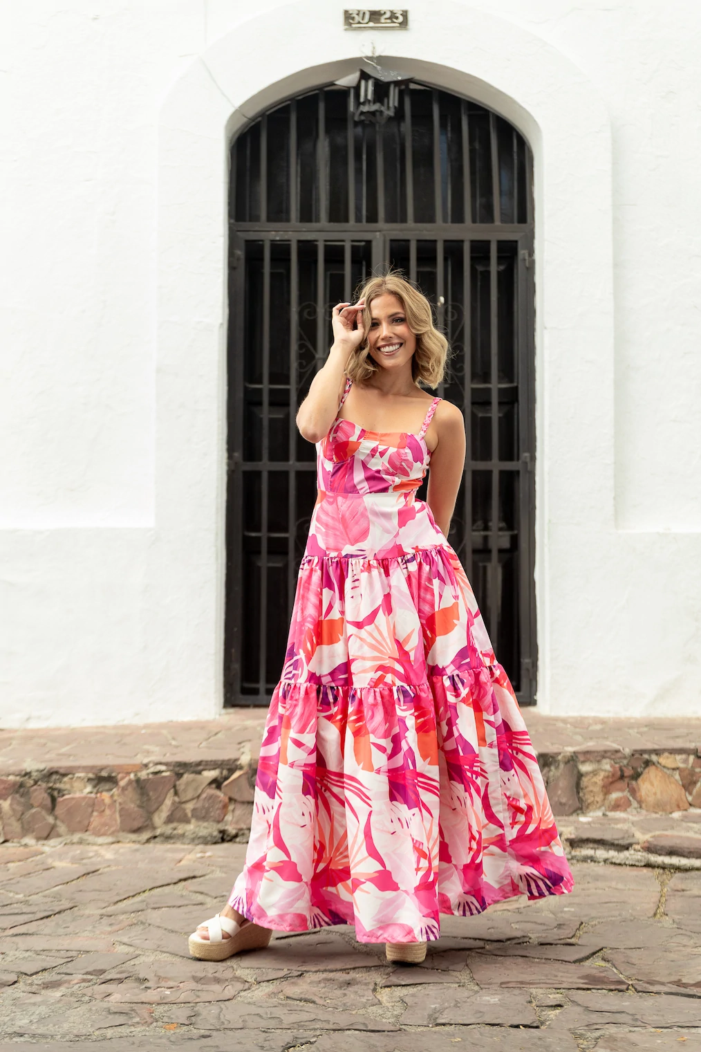 Vestido largo en popelina sublimada, corte sobre la cintura, tiras trenzadas, cierre en el lado, falda rotonda