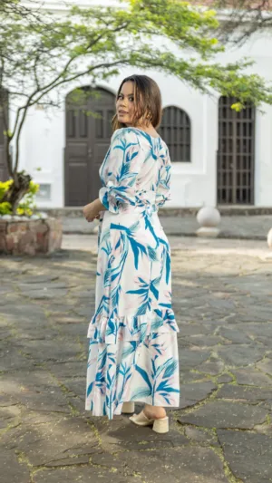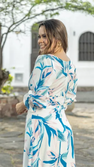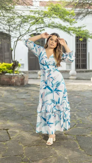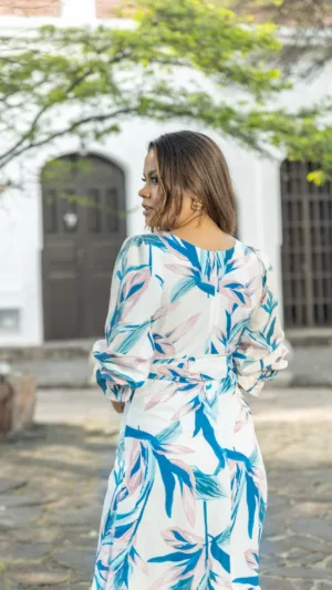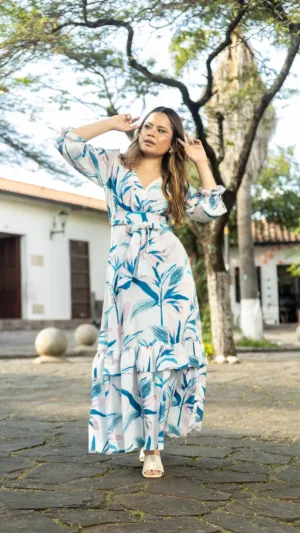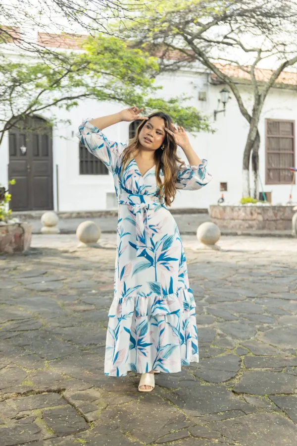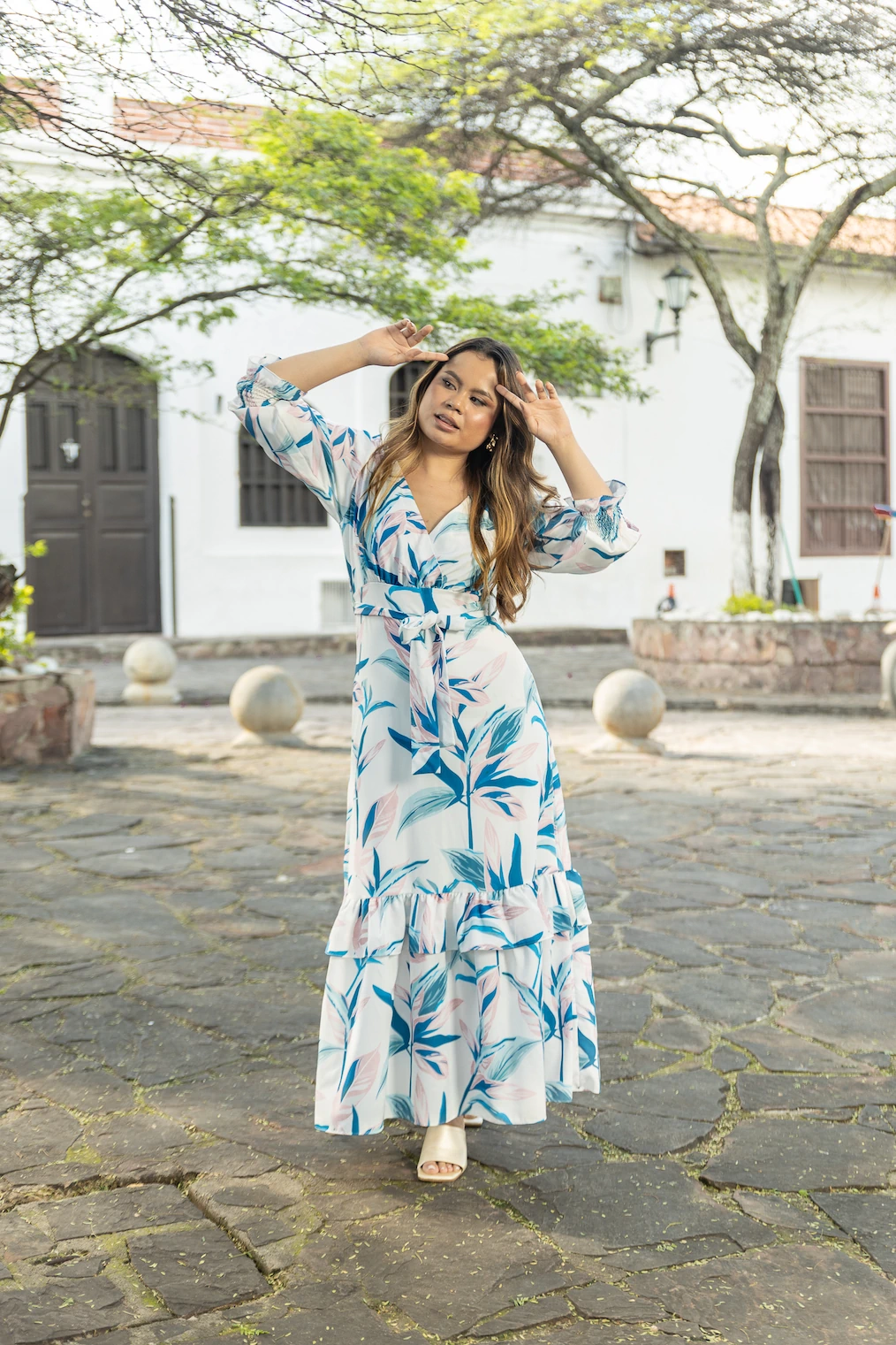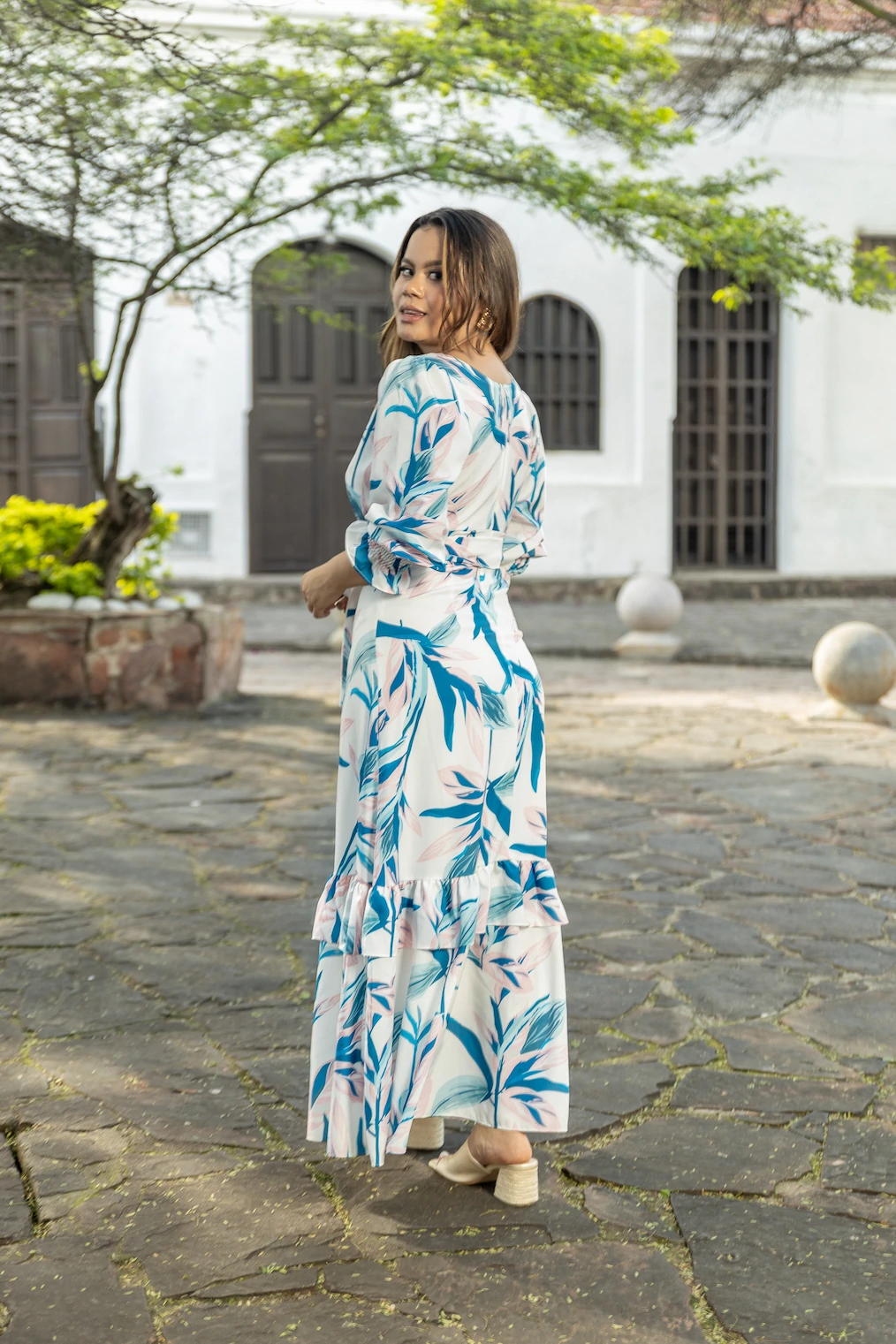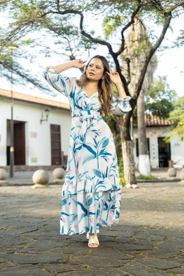 Vestido largo en seda sublimada, manga larga, con corte en la cintura y cinturón, cuello v, espalda cubierta
